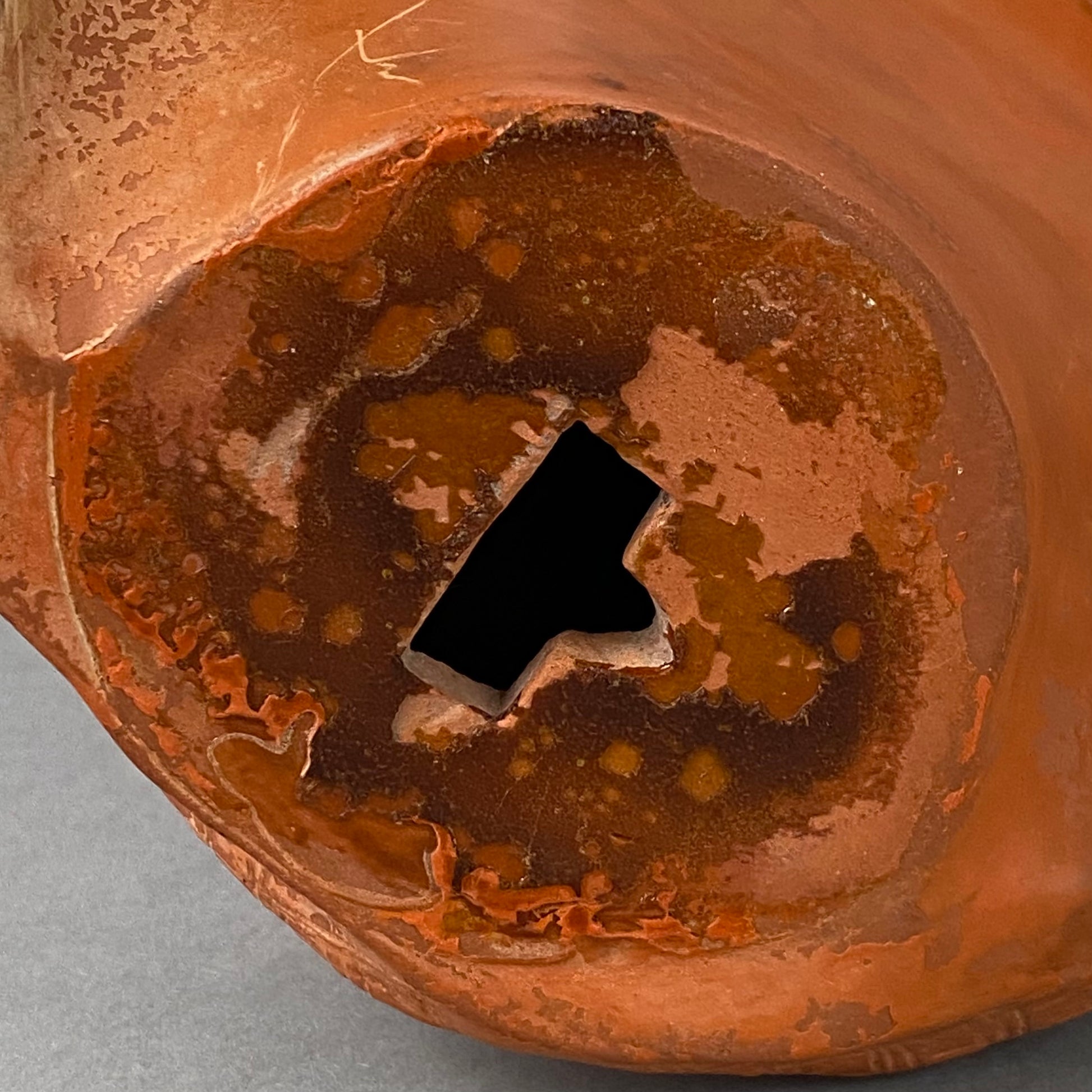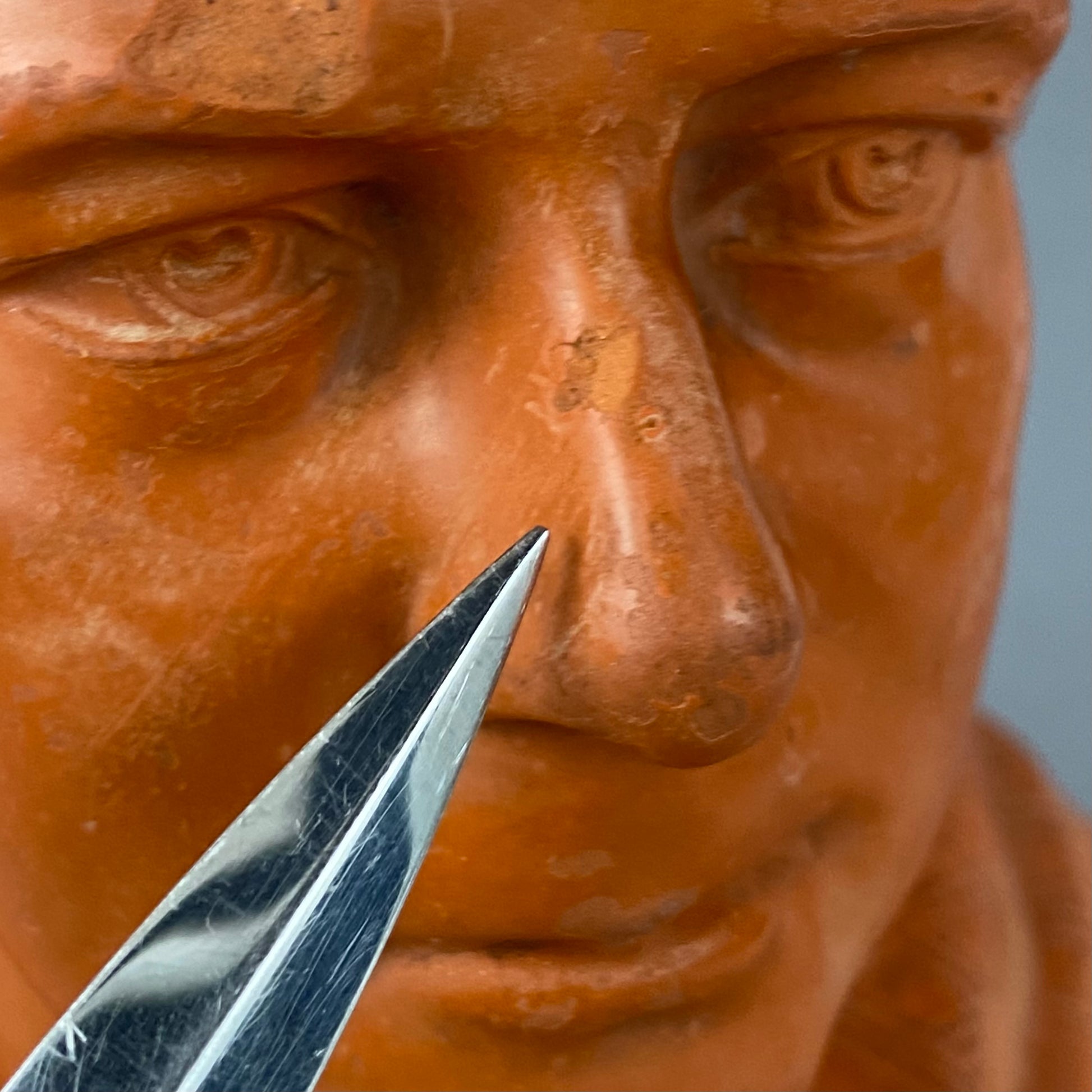 - Condition: Inspection found the piece has some wear to the surface in some areas due to the delicate composition of terracotta. There is some glaze loss to the nose area and above one eyebrow.