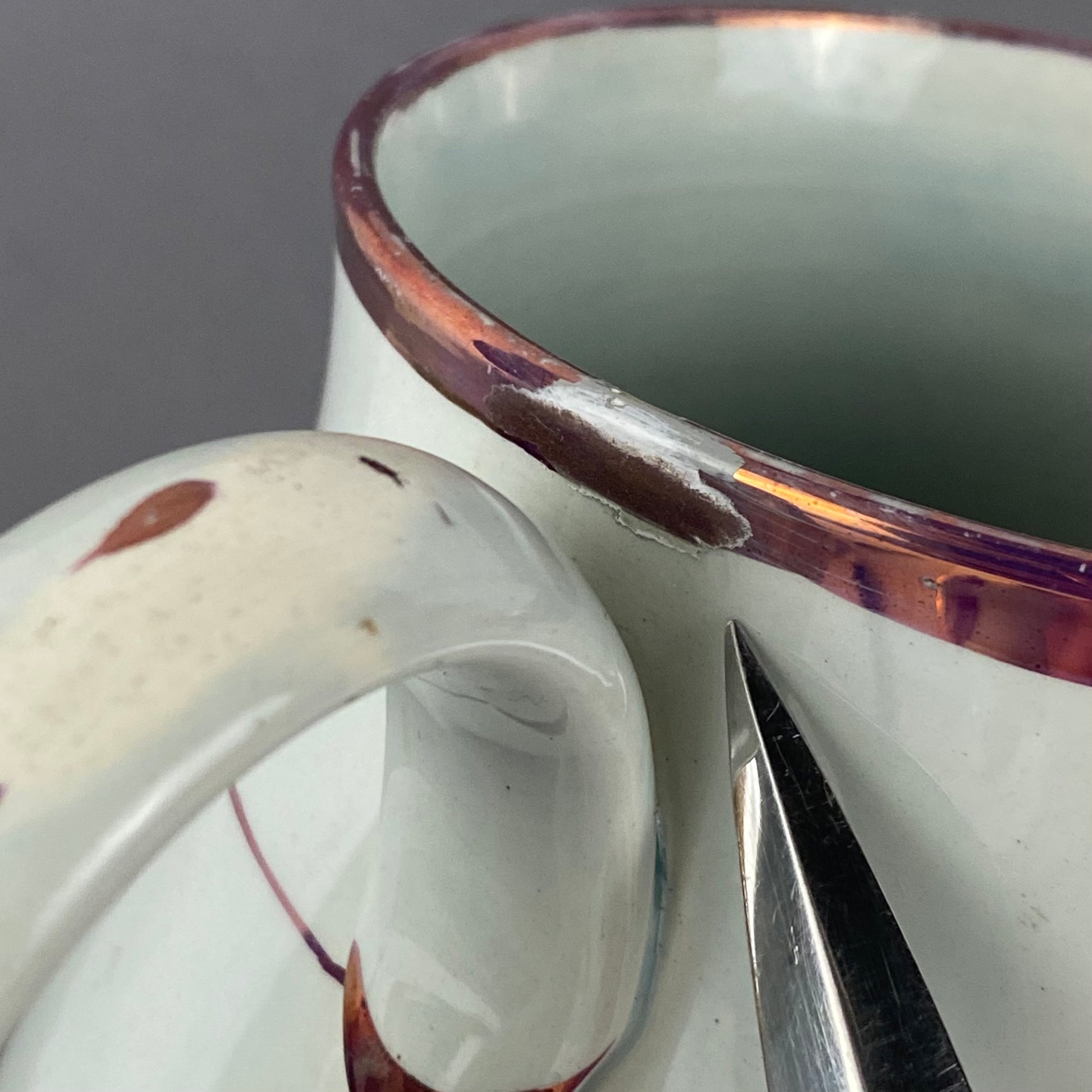 The piece is very good condition. Inspection found just one very small graze on the body of the spout. There is a small area of historic restoration to the rim of the pot above the handle and to the underside of the lid rim. There are small surface scratches which are commensurate with age.