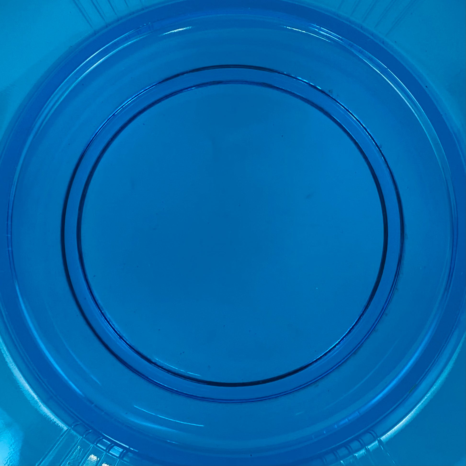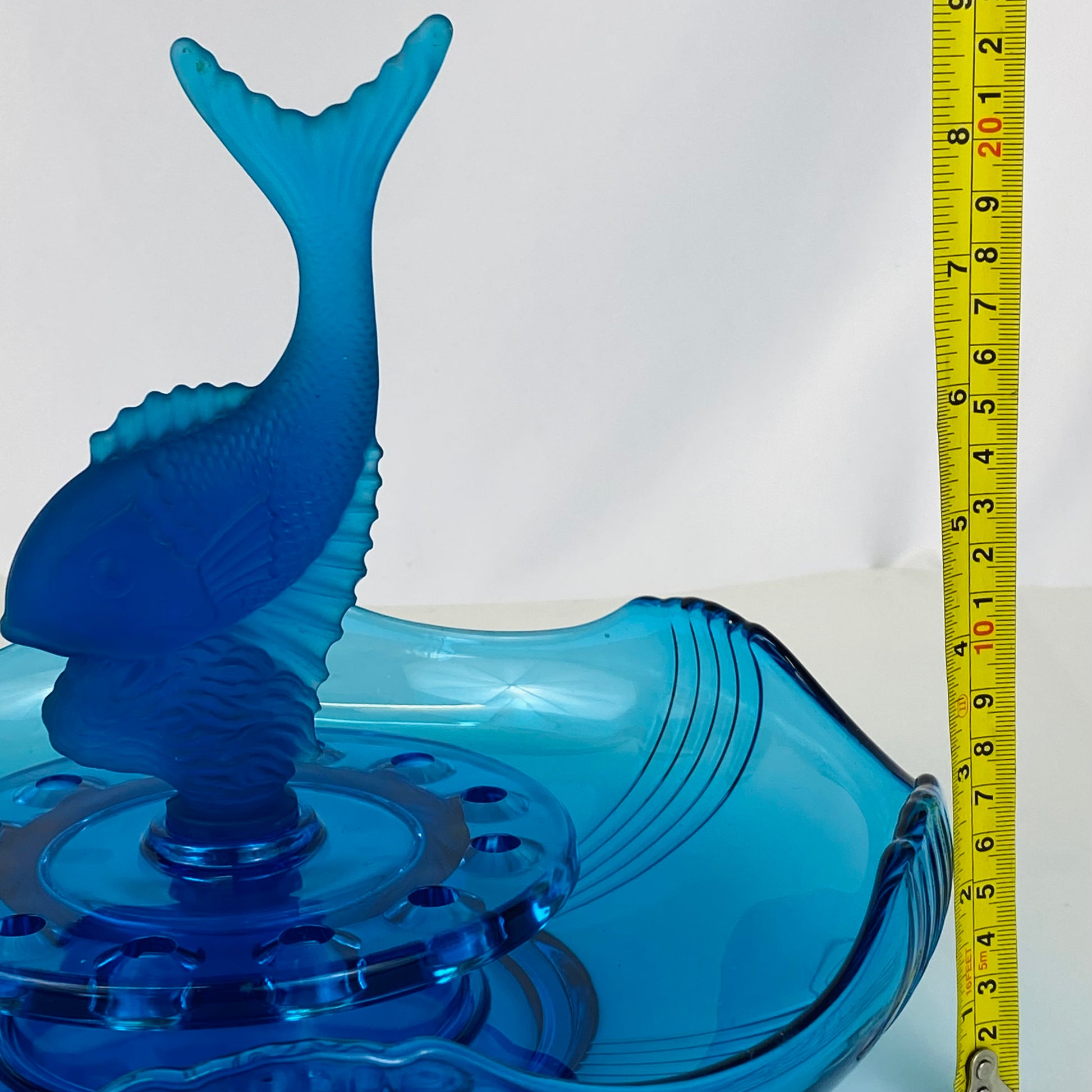 A very beautiful turquoise or aqua blue flower bowl. The set includes three pieces, a large bowl, Flower holder with hole inserts known as a frog, and sculpted fish centerpiece.