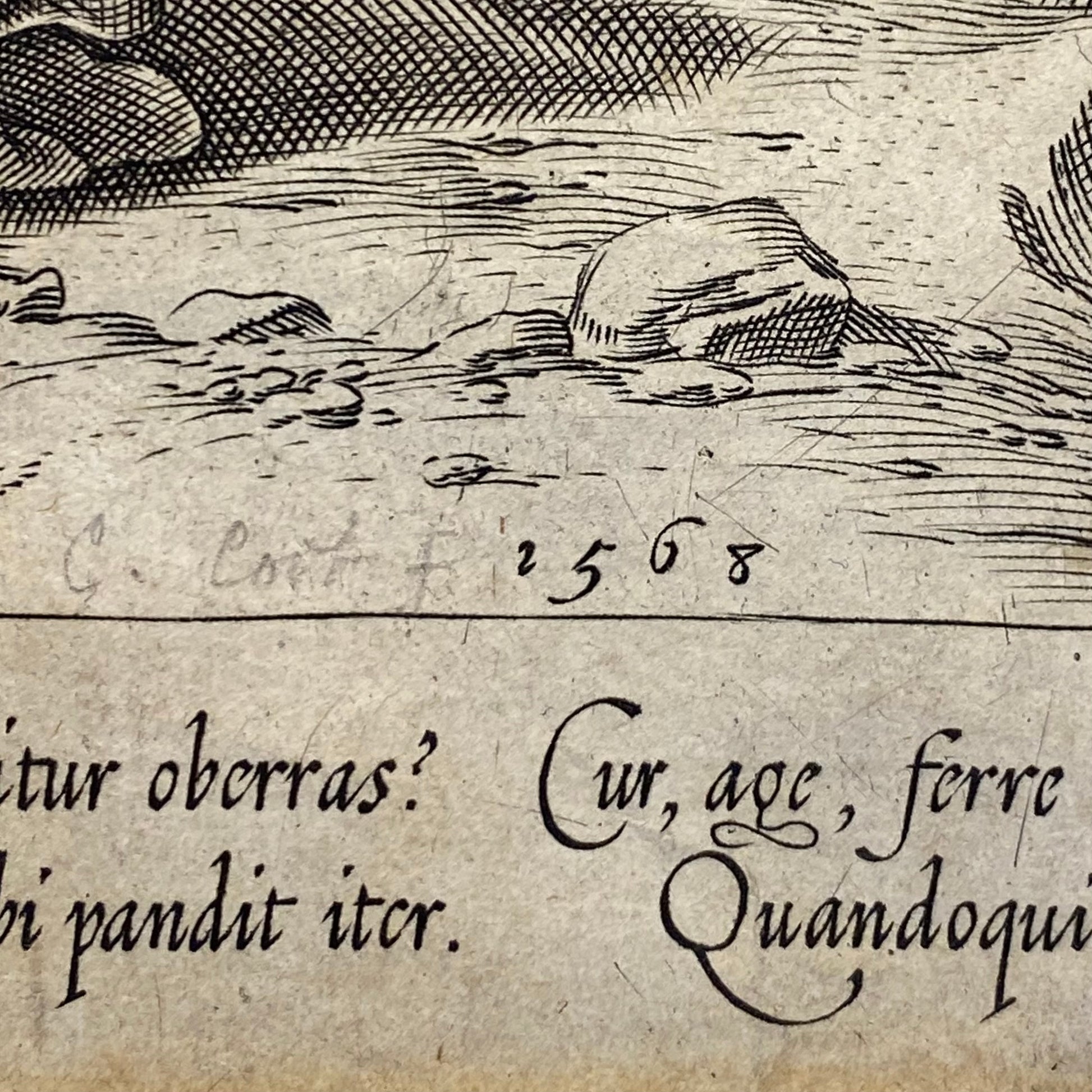 The plate bears the inscription “Don Iulio Clovio de Crovatia inventor”, confirming Giulio Clovio as the designer, along with the publisher’s imprint “Romae Ant. Lafrery”, firmly placing the work in Rome during the mid-16th century. The engraving is recognised in scholarship as the work of Cornelis Cort, Clovio’s principal engraver during this period.
